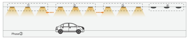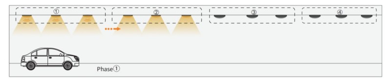 2. Quando o carro vai para o Grupo2, o sensor do Grupo2 ativará o próximo Grupo1 e o Grupo3. As outras luzes ainda estão apagadas.