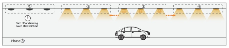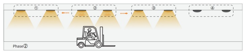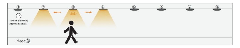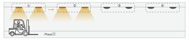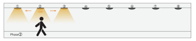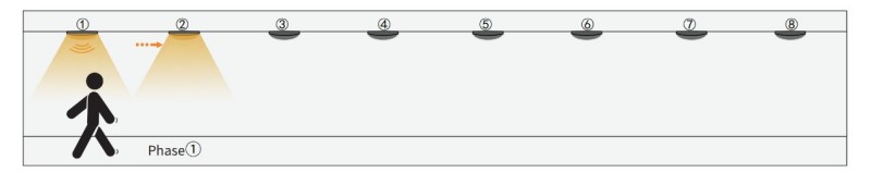1. Quando o sensor do Grupo1 detecta qualquer movimento, ele ativará o próximo Grupo2, o Grupo 1 e o Grupo2 ligarão. No entanto, o restante das luzes ainda está apagado.