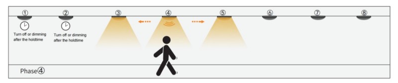 4. Quando as pessoas em todo o Grupo 4, o Sensor do Grupo 4 ativará o seu GRUOP3 e o Grupo5 vizinhos. O resto das luzes ainda está apagado. O Grupo 1 e o Grupo 2 desativarão ou diminuem, pois o sensor de movimento não recebe ou detecta nenhum sinal de RF após um longo tempo.