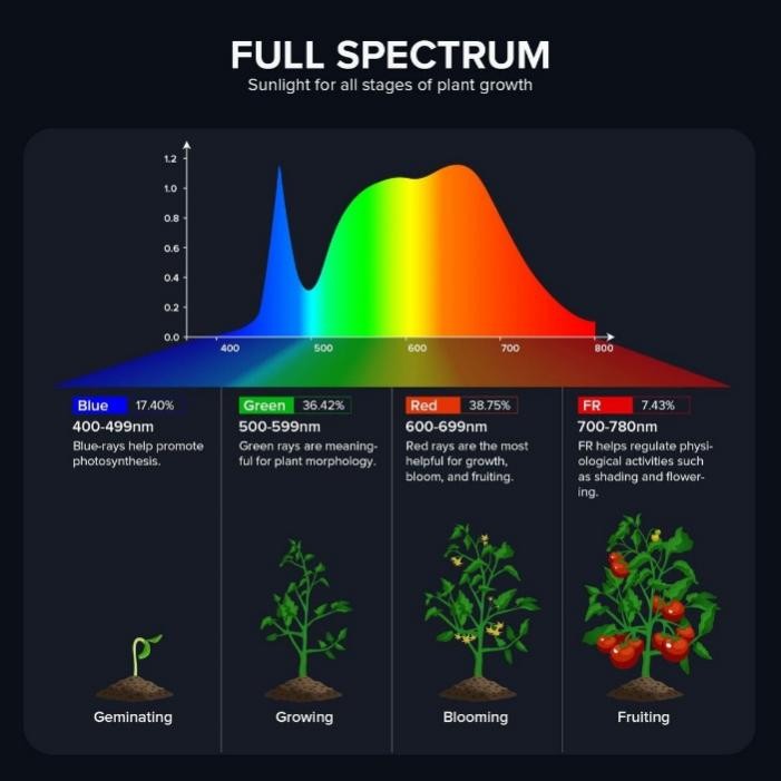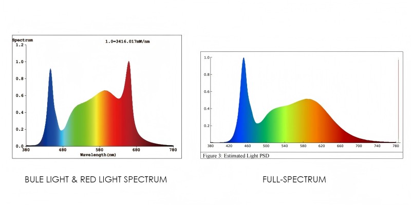 Existem apenas dois espectros de luz vermelha e azul na luz de crescimento vermelho-azul, enquanto a luz da planta de espectro total simula a luz solar e o espectro é o mesmo que a luz solar, emitindo luz branca. Ambos os espectros podem afetar a luz de enchimento e promover o crescimento das plantas. No entanto, é necessário escolher o espectro adequado para diferentes plantas.